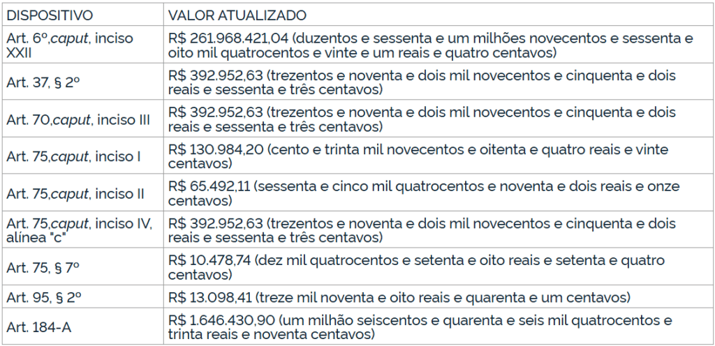 Para a atualização dos valores de 2026 houve a edição do Decreto 12.807, de 29 de dezembro de 2025, que entrou em vigor no dia 1º de janeiro de 2026.