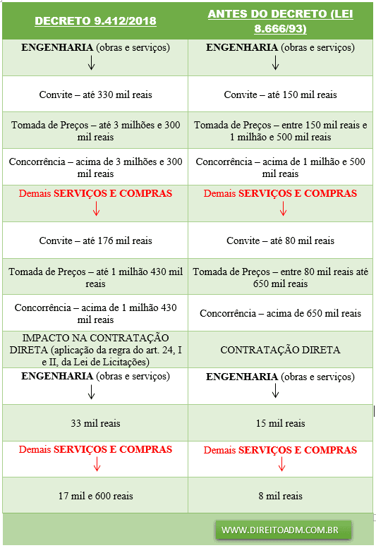 Em pleno trâmite avançado de projeto de lei (Projeto 6814/2017, apensando ao PL 1292/95, originário do PLS 559/2013: que conta com a oitiva de especialistas, pregoeiros, autoridades de controle externo e juristas) que procura disciplinar a nova Lei Geral de Licitações e Contratos, houve a edição do Decreto 9.412/2018, que atualiza valores de modalidade de licitações que estavam congelados há décadas.